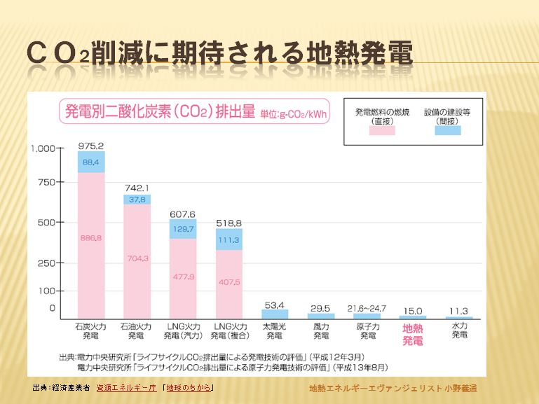 最近影が薄くなったCO2削減ですが地熱発電は直接CO2を排出せず、建設の過程で間接的にCO2が排出されるだけ。
