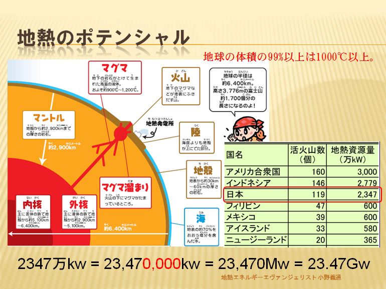 アースポリシー研究所(Washington, DC) によると「地球の表面を覆う地殻の最上部、厚さ約10キロメートルの範囲に存在する 熱エネルギーは莫大で、すべての石油と天然ガスの資源を合わせたエネルギー量の5万倍にもなる。」 ということです。